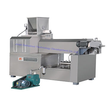With rice flour, coarse grain wheat flour and other as raw materials, After being extruded and matured, the products with novel shapes of shell, screw, square pipe and round pipe are produced.